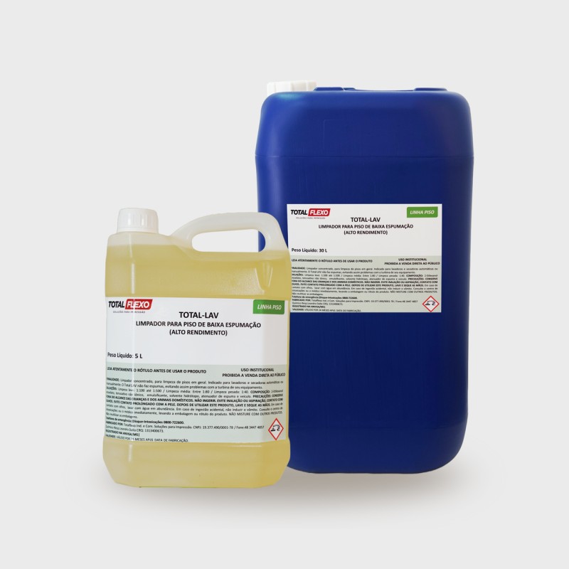 Limpador concentrado, para limpeza de pisos em geral. Indicado para lavadoras e secadoras automáticas ou manualmente. O Total LAV não faz espumas, evitando assim problemas com a turbina de seu equipamento.